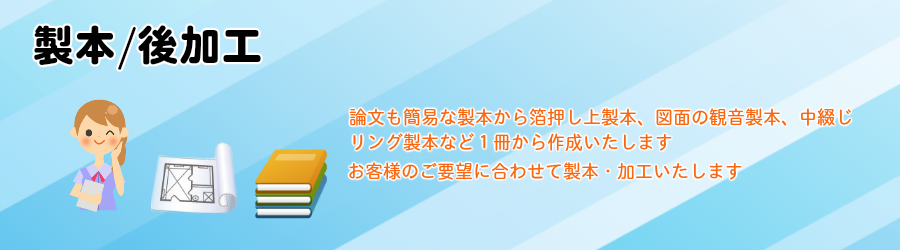 観音製本 図面を二つ折りにして、背の部分と小口の部分に糊を塗布して貼り合わせていく製本です。広げやすくて見えやすいので図面製本に最適です。表紙もハードカバー、ダイヤスカーフ、ダイヤボードなど豊富にございます。 |